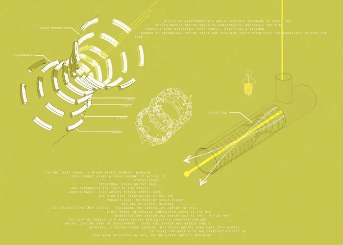 Tomecek Studio Architecture participated in an AIA sponsored design competition centered on the design of a series of recycling kiosks to be installed in downtown Denver. During that exercise, our focus slowly shifted from the individual receptacle to larger questions about the fundamental inefficiencies of the current means of solid waste collection. While exploring the possibility of a city wide waste collection infrastructure, we hoped to open a new forum for discourse on the future of waste management within the larger context of sustainability.