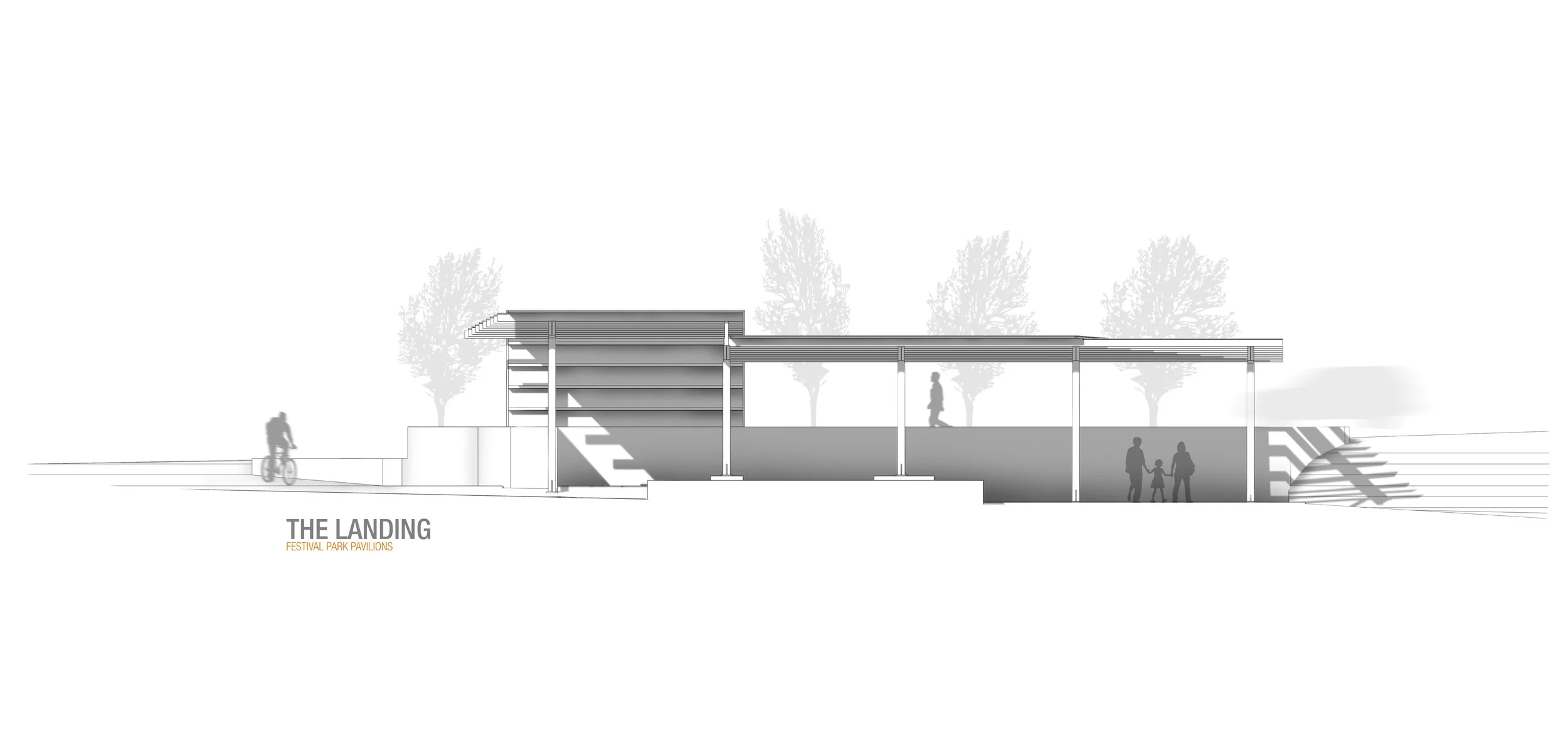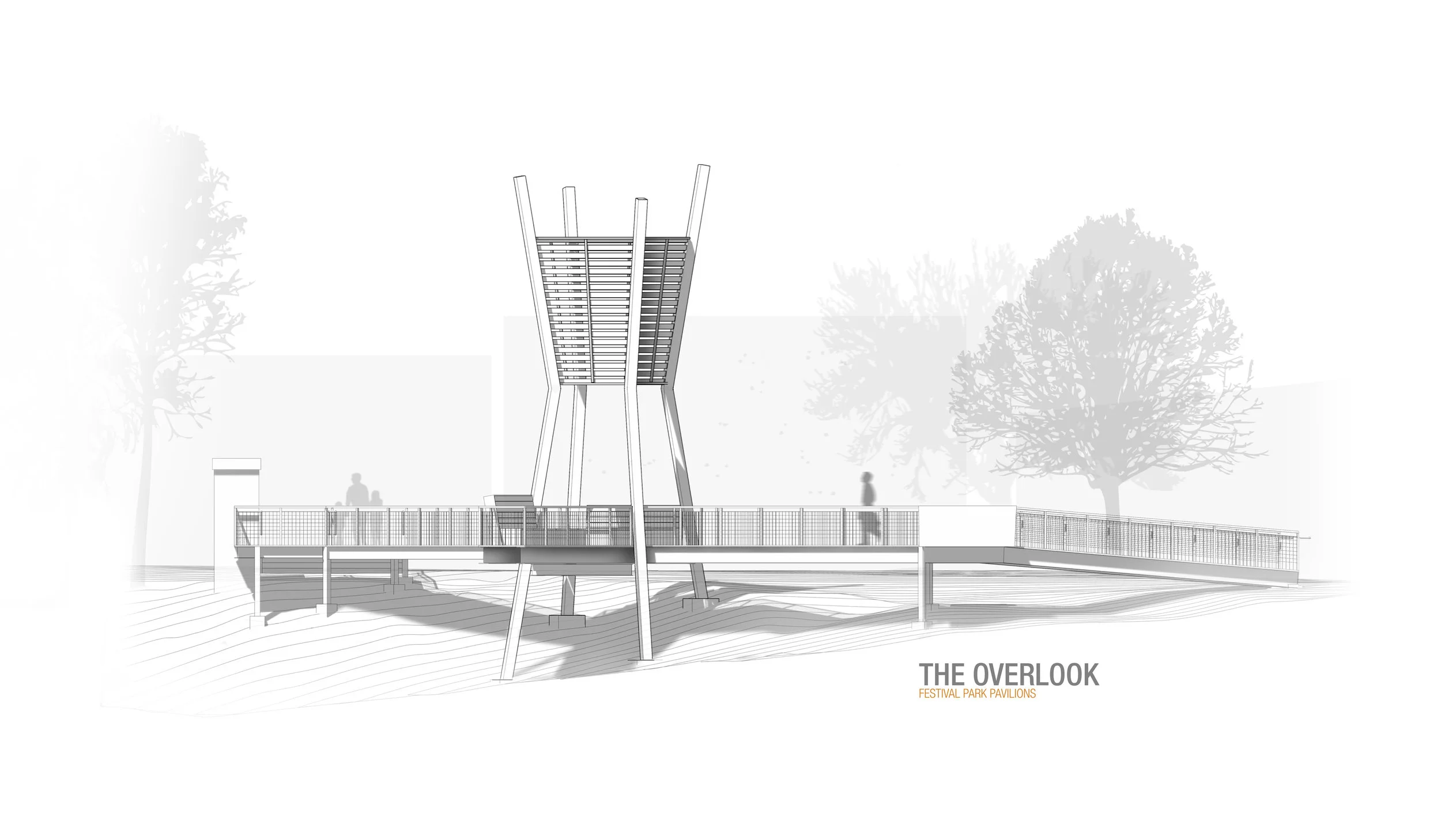 A revitalization project for the town of Castle Rock, this three-acre urban park connects city hall across the creek to the downtown core. Two pavilions were conceived to enhance the identity of place. To the east is ‘The Landing’ an anchor space which uses raw materials of concrete, wood and steel to create a large covered gathering area. To the west, the ‘Overlook’ is cantilevered 20’ above the creek below. This pavilion consists of three vertically bent steel beams with a horizontal wood slatted enclosure above offering an instant town icon by day and glowing lantern by night (in collaboration with Design Workshop).
