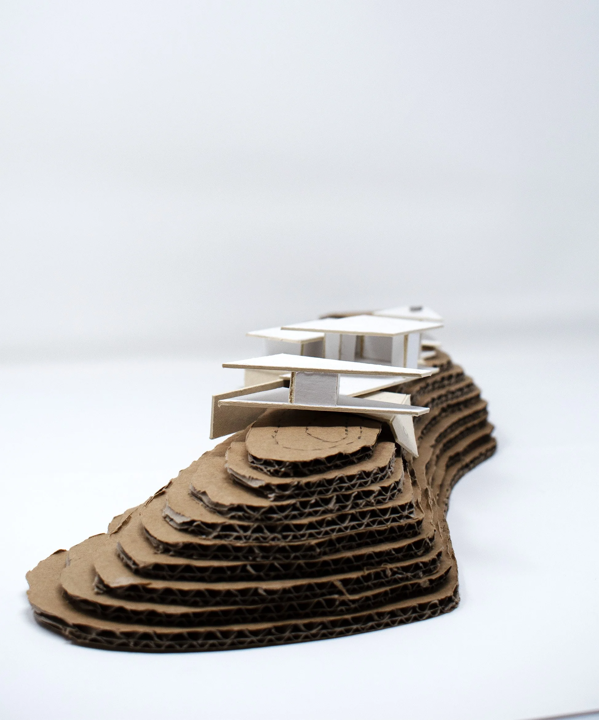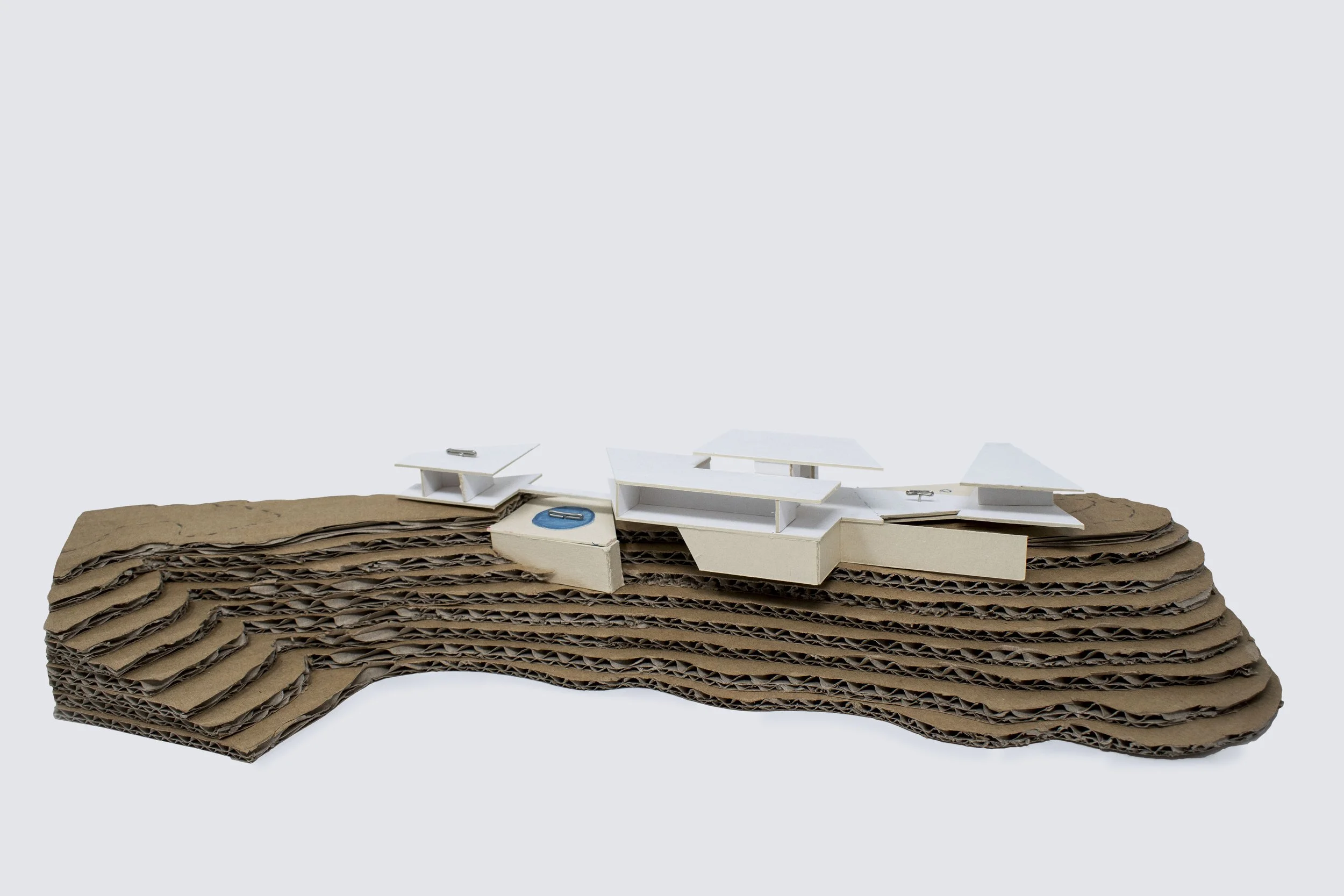 The Hill Station sits atop the crest of an east west running foothill. While the site ridge is easily accessed by vehicle, the 10-acre property only has a narrow 300’ long build-able area averaging 30’ wide. The project is shaped by this site feature and straddles the peninsula tightly as the grade drops off 280’ to the rear of the property. The concept is to touch the ground lightly and float above rocky terrain by using Blue Sky Building Systems light gauge framing technique. This system, originated in California, utilizes a bolted post and beam strategy to achieve moment-frame connections. Implementing this system will minimize excavation and save costs while preserving the natural landscape.