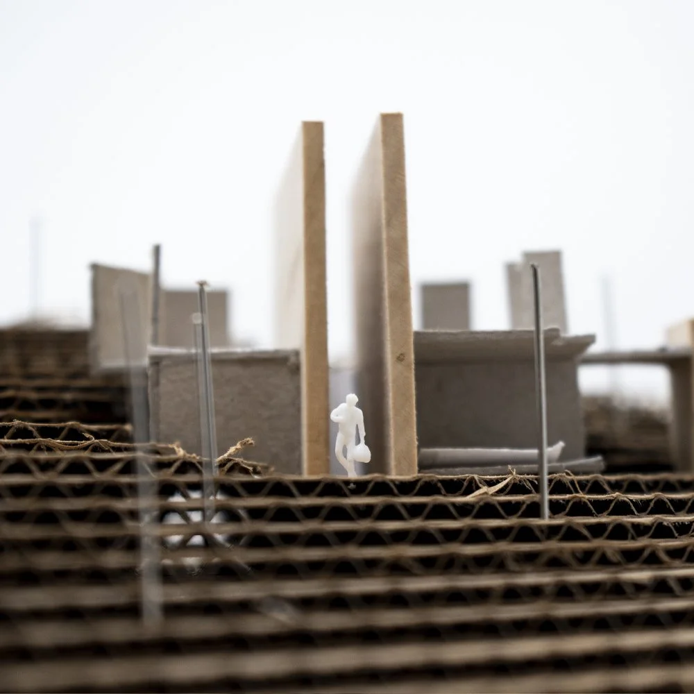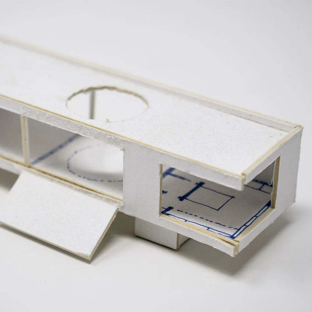 The Shoshone residence is envisioned as a monumental limestone volume that will house an eclectic collection of art and sculpture. The project examines unique lighting conditions throughout the day by utilizing a series of curved light scoops to direct and filter the illumination.