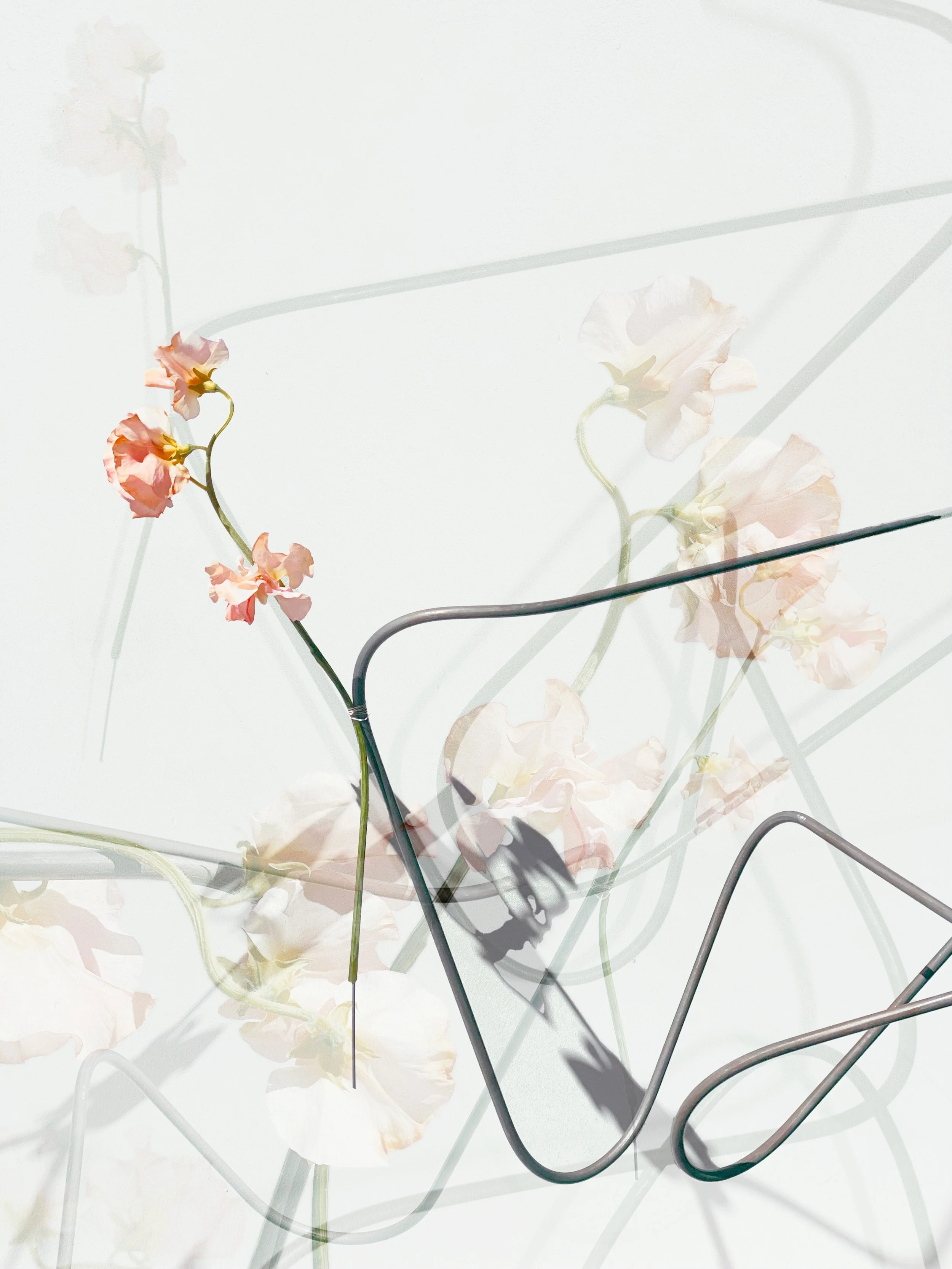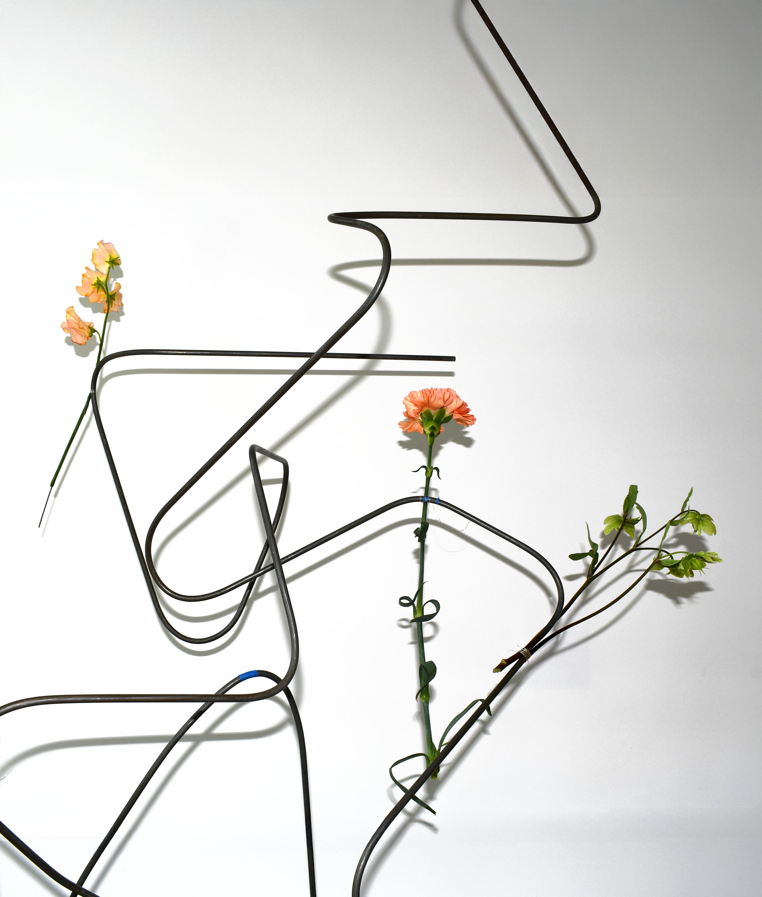 Steel Trace explores space and volume by challenging the traditional role of the vase. Typically designed to contain, this vessel is stripped of its volumetric function and instead relies on the tension between structure and flower—between the rigid and the organic. Formed from a continuous line, this vase transforms a one-dimensional element into a spatial, physical presence. Crafted from hot-rolled 1/4” steel rod, the line is bent into an object that you can walk around, peer through, and experience as it casts shifting light and shadow. It frames absence, suggesting volume without enclosure, and invites interaction not through utility, but through perception and movement. It is not a container, but a question: Can gesture alone hold presence? Can a void be full?